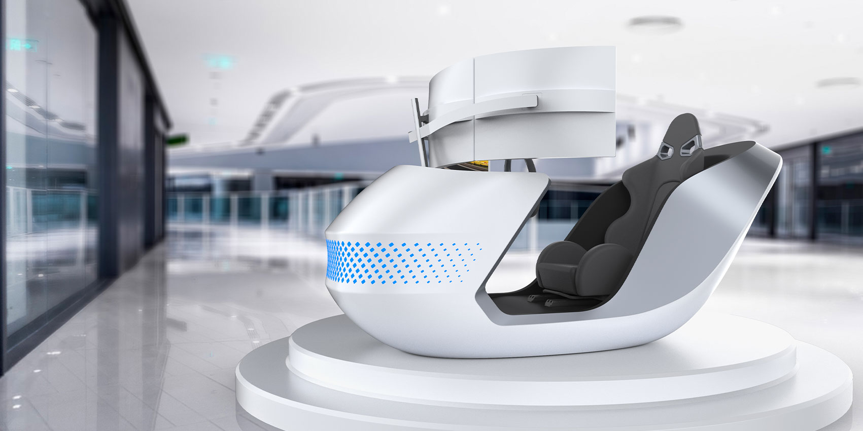 這款模擬駕駛艙造型靈感來自于天鵝,流線型設(shè)計賦予其優(yōu)雅的外觀,同時也象征著駕駛的速度感與未來感,富有生命力。采用藍色點狀燈作為艙頭的裝飾燈,提升了設(shè)備整體的氛圍感。三屏液晶顯示器高度模擬賽車的真實環(huán)境,座椅能夠自動調(diào)整角度和支撐力度,給駕駛員帶來更逼真的駕駛體驗。